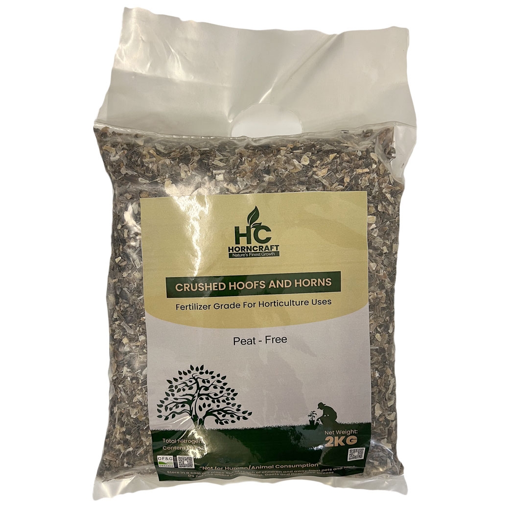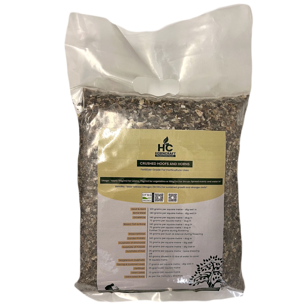Crushed hoof and horn (CHH) is a slow-release organic fertiliser with high nitrogen content. TheNitrogen present in CHH is not more that 16% and decreases to 13% with the increase of impurities and refining grades. When water is present, CHH swells considerably, then macerates, leaving cavities that makes the soil to aerate and more apt to root respiration and oxygenation processes.